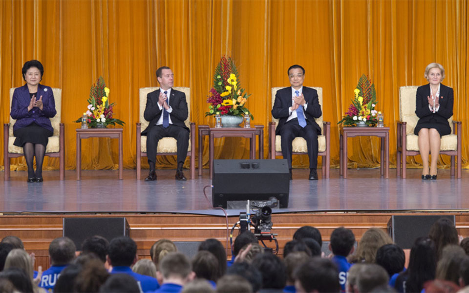 2015年12月17日,国务院总理李克强在北京人民大会堂与俄罗斯总理梅德韦杰夫共同出席中俄青年友好交流年闭幕式暨中俄媒体交流年开幕式并致辞。