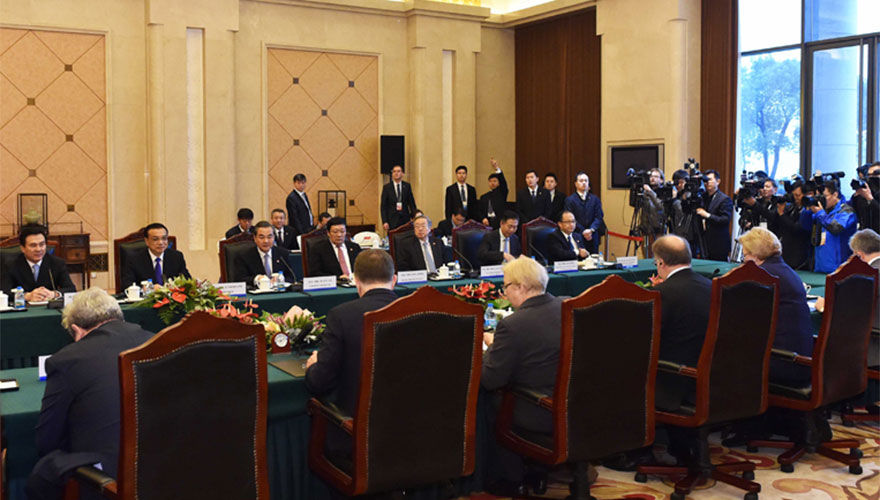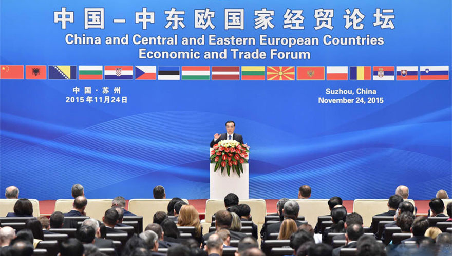 11月24日,国务院总理李克强在苏州太湖国际会议中心与中东欧16国领导人共同出席中国-中东欧国家第五届经贸论坛开幕式并致辞。