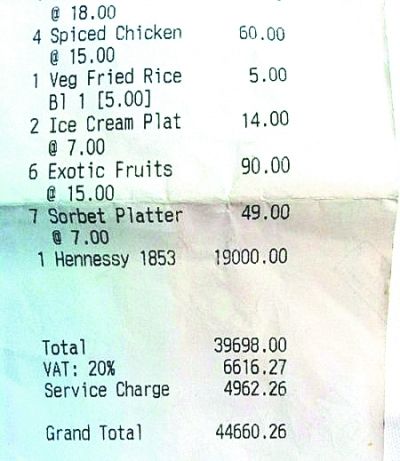 ¡¡¡¡ÎªÁËÖ¤Ã÷×Ô¼ºµÄ»°ÊÇÕæµÄ£¬Ëû»¹É¹³öÁËÊվݡ£´ÓÕâÕÅÊÕ¾ÝÉÏ¿ÉÒÔ¿´³ö£¬Ê³Îï¼Û¸ñ²¢²»¹ó£¬±ÈÈçÀ±×Ó¼¦15Ó¢°÷Ò»·Ý£¬Ê߲˳´·¹5°÷Ò»·Ý£¬Ë®¹û15Ó¢°÷Ò»·Ý¡¡µ«ÊÇ£¬Ïû·ÑÁËһƿÐùÄáÊ«°×À¼µØ(1853)£¬¼Û¸ñÊÇ1.9ÍòÓ¢°÷¡£×îºóµÄ×ܼÛÊÇ39698Ó¢°÷£¬ÔÙ¼ÓÉϸߴï4962°÷µÄ·þÎñ·Ñ£¬¿°³ÆÌì¼Û¡£ÍøÓѶԴ˸е½Ê®·Ö²»Âú£¬ÈÏΪ°ÂÔË»á¹ÙÔ±ÔÚÀÄÓÃÄÉ˰È˵ÄÇ®¡£