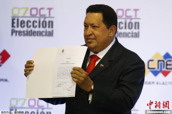 当地时间10月10日,委内瑞拉加拉加斯,委内瑞拉全国选举委员会正式宣布任命查韦斯为下届委内瑞拉总统,任期为2013年至2019年,并为他颁发了证书。