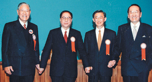 1996年首届台湾地区领导人民选,四位候选人李登辉、林洋港、陈履安和彭明敏(由左至右)参加电视政见发表会,出现第一次同台的画面。图片来源:台湾《联合报》