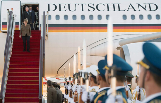 【环球网综合报道】2015年10月29日,德国总理默克尔乘坐专机抵达北京国际机场,三军仪仗队列队欢迎。据悉,默克尔将于今明两天访问中国。除了会谈等活动外,她将在国务院总理李克强的陪同下到访安徽省的一户农民家庭和一所乡村小学。一直以来,中德高层间保持着频繁的会晤,此次是默克尔第八次访华,创西方国家领导人任上访华次数之最。