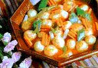 3.锅中置油1大匙炒胡萝卜、菠萝,续入青椒、番茄汁、马铃薯球、糖,滚后以太白粉水勾芡。