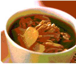 3.在煮好的杜仲汤中放入素腰花,然后一起煮开加入盐,出锅后点麻油即可。