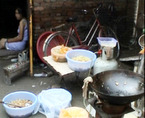 第三天9点多钟,记者们来到了位于中坞村的这家制作盒饭的餐馆儿,小餐馆门前是一片发臭的污水滩儿,门外放着一些送餐时赠送的水果,抖一抖水果箱上半遮半掩的盖布,苍蝇横飞。走进屋内,几名小工正在忙着装盒饭,她们既没有带一次性的手套,也没有带口罩,一会儿拿勺子,一会儿又摆弄盒中的菜,手不停,嘴也不停,有说有笑的;门口有个孩子在打闹,一个孩子拿出带污水的拖把在门口乱舞;菜放在脏兮兮的盆中,装了菜的餐盒就在放洗手的脸盆旁,狭窄的装菜间里边是居住的地方,一些蔬菜和粮食就摆在床头和床上。后厨操作间与装菜间直接相通,装菜的小工不停地出出进进,来到后厨,两个炒菜的师傅正忙着,满脸满胳膊的汗水。