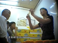 你是不是要问了,这些东西到底值多少钱呢?我们在成都的一家市场找到了这种洗涤剂的批发商。经过一番讨价还价最后以记者以每箱60瓶125元的价格成交了,算下来每瓶的价格在2元左右,那套茶具在这里也只卖10元左右,所以连茶具带洗涤剂总价也不过十多元钱,她们送你一套就有40左右的利润,也难怪这些人的兴致那么好了。
