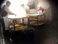 熬好的糖稀放些桔子香精,工人们将它抬到了搁放模具的木架前,倾倒、刮匀,三五分钟后就成形了。