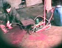 地上的这头牛刚被杀死,屠宰工熟练的将牛脖子里的两条大动脉给单拎出来,然后将特制的胶皮管插进牛的主动脉里,用绳子帮紧,胶皮管的另一头连着高压喷雾器,喷雾器的另一头则连着这个盛满热水的兰色塑料桶,准备就绪后,一个工人扳动高压喷雾器的踏板,开始给牛注水。