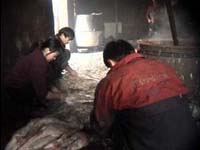 后来我们发现,这所大院子后面还有一个小院子,我们来到了里面的这个小院中,只见浓烟滚滚,一股刺鼻的怪味朴面而来,让人只想恶心呕吐!黑黑的大锅旁,只见一个伙计手里抓着一只刚刚退去大毛的鸭子,先将鸭子伸到烧开的沥青锅中滚一下,再提出来,然后把鸭子放进旁边的冷水缸中降温,等鸭子身上的沥青冷却形成一层黑皮后,用手一扒,鸭子就变得光溜溜的了。