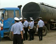 首先,民警在路口拦下了两辆巨宝公司驶出来的油罐车,接着进入巨宝公司的院子里进行检查。院子里停有十几辆油罐车,在车辆旁边扔着很多汽车钢板。检查人员人员,这些车子好像都改过,加厚了,检查还发现,巨宝公司的营业执照上并不允许经营有毒及危险品,但我们采访的几天中不断地发现他们在运输甲苯、混合油、燃料油等。
