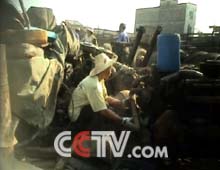 在另一个院子里,我们看到了汽车的心脏---发动机。这家院子的规模很大,近五千平米的地方挤满了各种各样已经拆解的旧车。卖主向我们推销一台发动机,刮开厚厚的油垢,我们看到,这台发动机是1994年生产的。