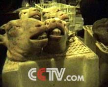 记者来到辽宁省沈阳市于洪区的东瓦窑村,刚一进村子,就闻到了刺鼻的腥臭味,村口就是一个大垃圾场,可我们发现,那种腥臭味却不是垃圾场发出的,哪儿来的呢?拐过垃圾场,记者看到一家民房,只见门口的一辆农用车上堆放着一些动物尸骨,上面爬满了苍蝇,一阵阵臭味传来! 走进屋里,满是污水的地面上,已经堆满了已经剔了肉的羊头骨,屋里的一个池子里浸泡着一些羊头和牛肚,屋里没人。
