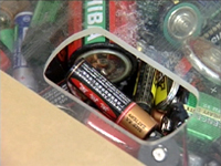 据我们了解,不管是在城市还是农村,随意丢弃废旧电池的现象都十分严重,看来,人们对废旧电池造成的污染还没有太多的认识。这是一节一号电池,如果这节电池烂在地里,就能使1平方米的土壤永久失去利用价值,这是一粒纽扣电池,把它丢在水中就能使600吨水受到污染,而600吨水相当于一个人一生的饮水量。