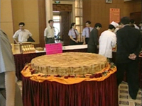 对了,还要提到的是月饼王,它诞生在广东省的佛山市,体重是330公斤,身高30厘米,直径有130厘米,好像一张餐桌那么大,主要用的是白莲蓉,生产厂家说,为了做这个月饼王,他们公司20多位师傅忙了一整天。这月饼是金玉其外,优质其中的。