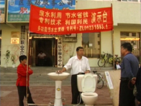 其实,不仅是国家在关注着节水问题,许多市民也一直把节水作为生活中的重要部分。在河北省廊坊市最近有一位老人备受大家的关注,有人说他改写了自来水冲厕的历史!在河北省廊坊市街头,大家总是可以看到,一个老人向市民演示一种坐便器。这这种坐便器是这位老人自己研究发明的节水坐便器。这位老人是廊坊市农机公司的一名退休干部,名叫徐海。他设计的这个多功能的节水坐便器,功能有两个,一个是洗漱废水的存储功能,第二个是自来水的备用水功能。这种坐便器科学的利用了洗脸池与坐便器的落差,将洗漱等生活废水,收集到坐便器的主水箱,用它来冲洗坐便器。老徐从1994年就开始琢磨厕所节水装置,2001年做出了第一个铁质样品。并且在今年3月获得了国家专利。
