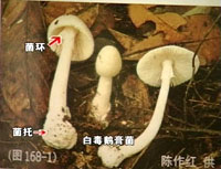 这种白毒伞样子虽然长得很普通,可却是被大家称做致命小天使的剧毒蘑菇,只要吃上这么一小棵就能让一个成年人中毒身亡。它的学名叫白毒鹅膏菌,它的特点是又有菌托和菌环,就像穿了鞋子带了围巾一样,一定要注意有这样特点的蘑菇千万不要采。