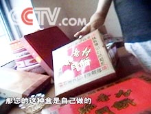 再看看这些月饼的包装盒,上面赫然印有“稻香村”的字样,老板很是得意,这都是他从北京的一些人手里买过来的。