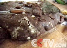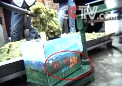 在容城县的一家名叫“鹤钧”的食品厂,我们见到了他们生产出来的“鹤钧”牌月饼馅儿。在苍蝇乱飞,没有任何卫生防护设施的条件下,月饼馅被铲进了包装箱里,箱子的外表写着草莓、哈密瓜等水果口味的字样。老板坦言,用冬瓜做水果馅没有什么奇怪的。与前一家一样,这家鹤钧食品厂,也是证照齐全。老板说,这个季节,他们的月饼馅销得不错。像天津、北京等地都有销售。