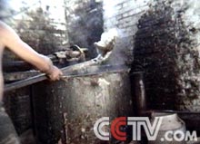 工人把地上的冬瓜不停扔进旁边的一个水槽里,另一个工人则把水槽里的冬瓜简单地涮一下,就把冬瓜块放进了粉碎机,一会儿,冬瓜块儿变成了冬瓜馅儿。工人们再把这些冬瓜馅儿用铁锨收起来,装进塑料箱,沥去水分。之后,工人们再把挤过了水的冬瓜馅倒入一口大锅,加入白糖,不停地搅拌翻炒。掉在地上的冬瓜馅也被工人铲起来,扔进了大锅里。