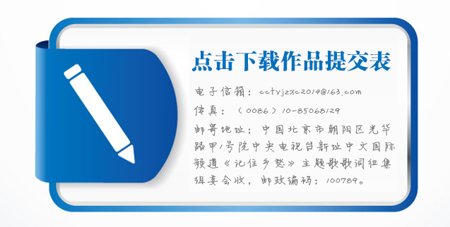 邮寄地址:中国北京市朝阳区光华路甲1号院中央电视台新址中文国际频道《记住乡愁》主题歌歌词征集组委会收,邮政编码:100789。(由于工作人员人手有限,所有作品概不退还,敬请谅解。)